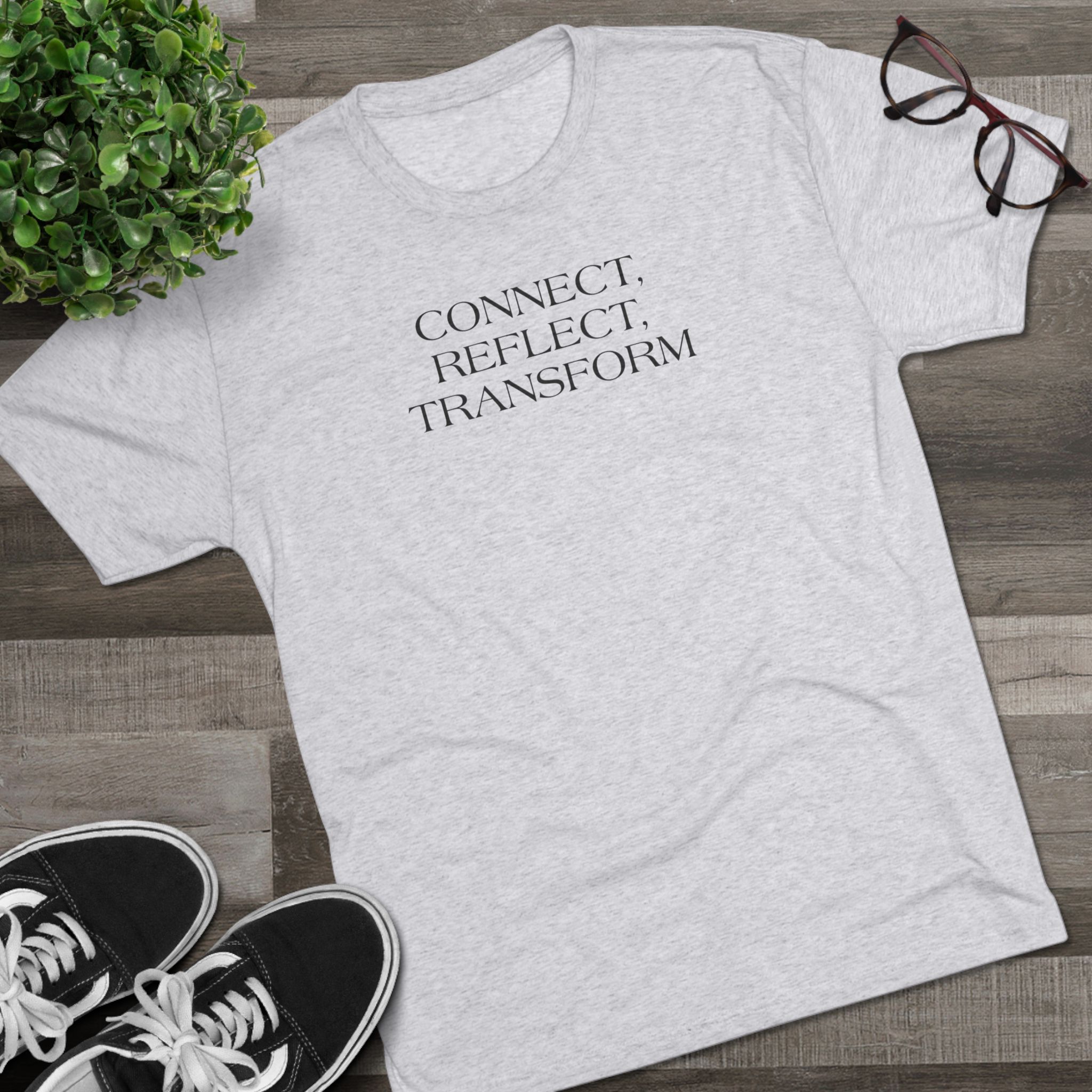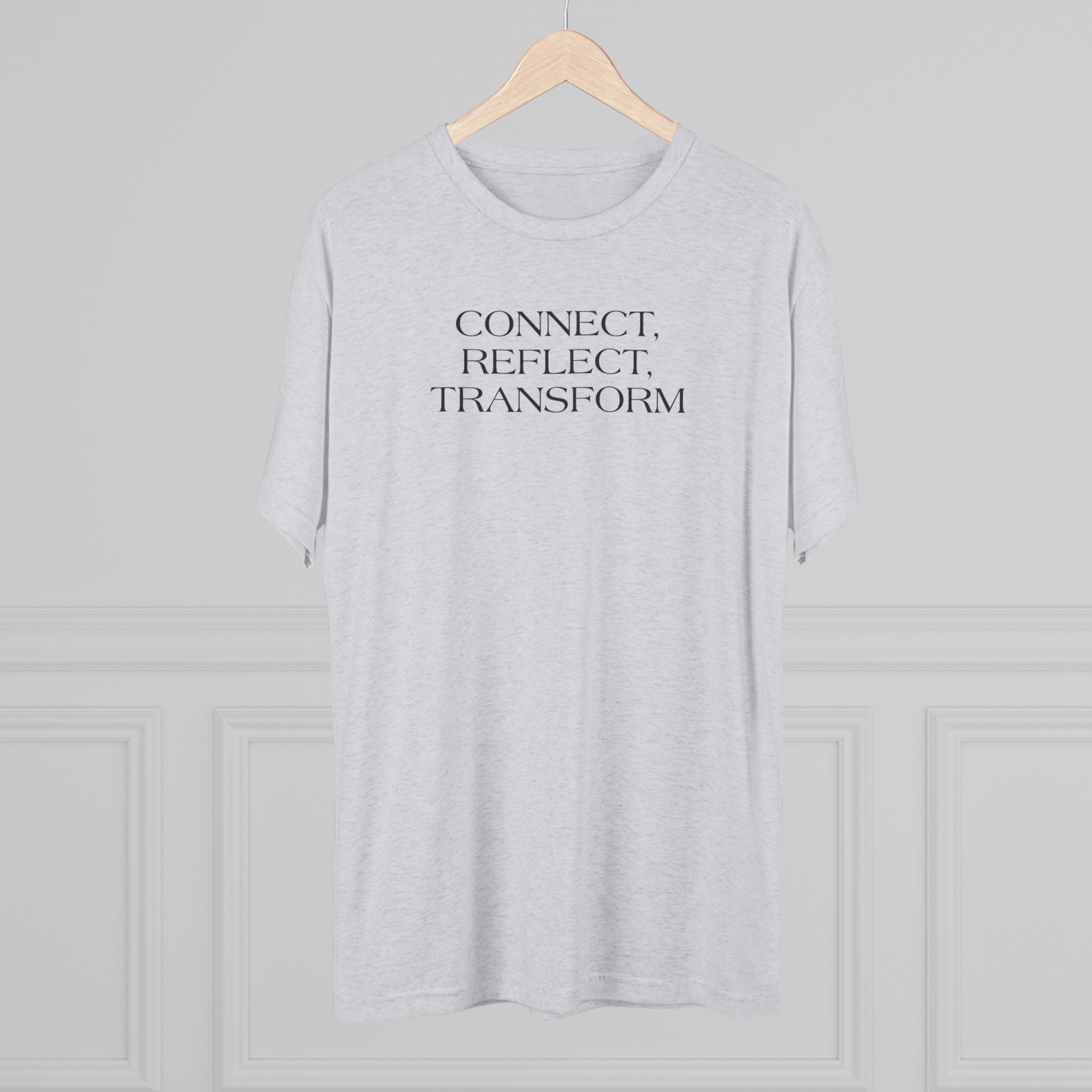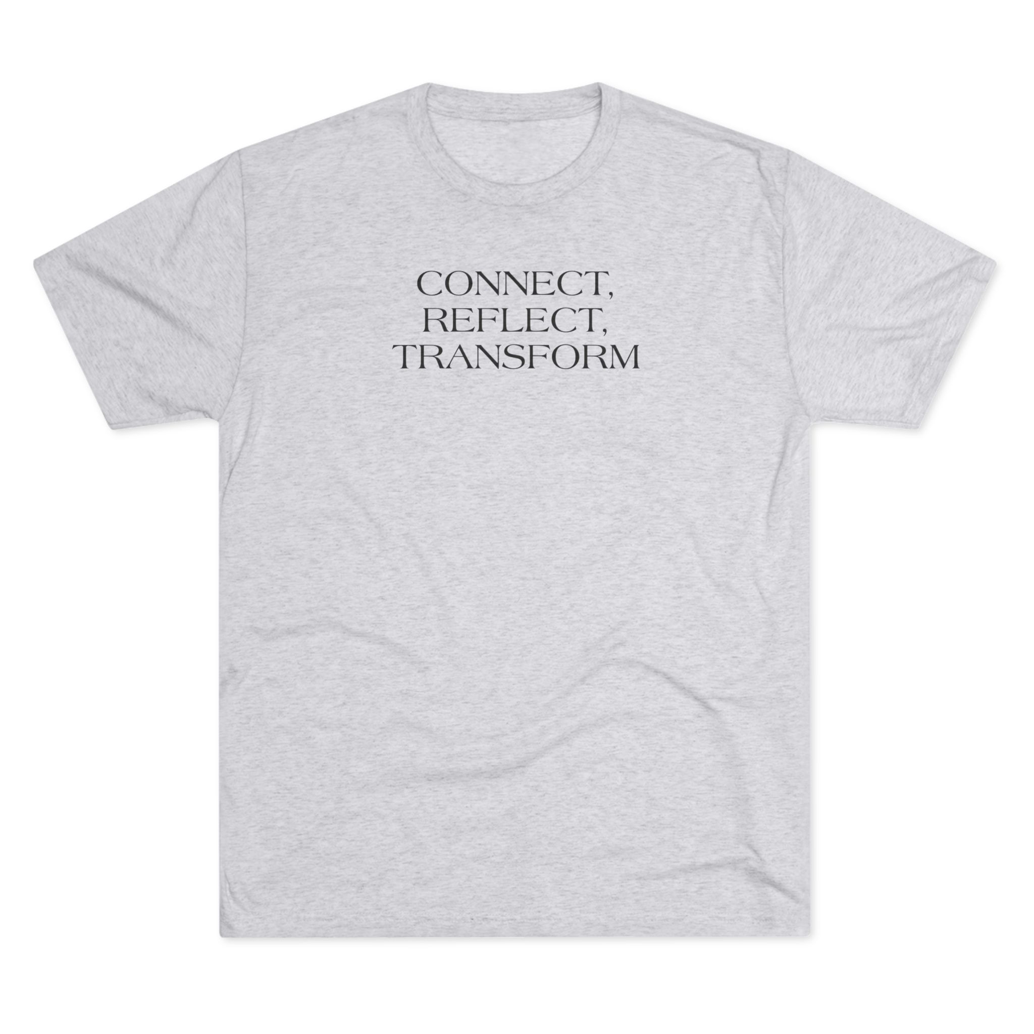 A lightweight, super-soft tee that carries a quiet, intentional message: “CONNECT. REFLECT. TRANSFORM.” Whispered in a minimalist serif at chest height, this shirt settles into the background of your day while nudging inward focus. The tri-blend drape feels lived-in from the first wear — breathable and flexible for long studio sessions, morning journaling, or calm walks. It pairs cleanly with relaxed jeans, layered cardigans, or yoga pants, fitting seamlessly into a mindful wardrobe.