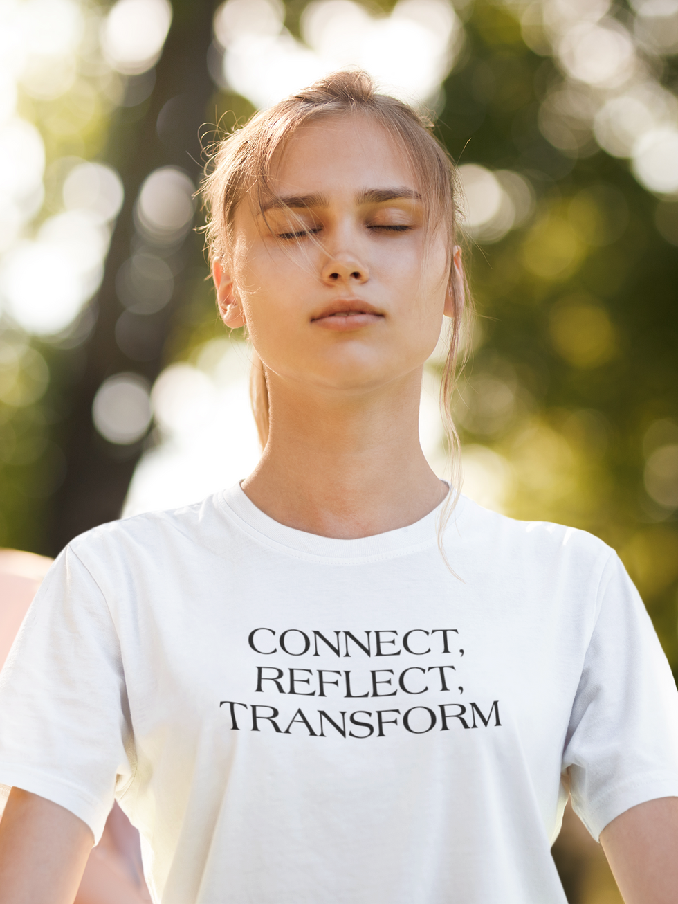 A lightweight, slim-fit tee designed for women who value quiet clarity and intentional living. The clean white shirt features a minimal, centered typographic design that reads like a small personal mantra—Connect. Reflect. Transform.—making it easy to wear as a reminder during morning routines, yoga classes, or mindful meetups. The soft, combed and ringspun cotton feels gentle against the skin, while side seams and shoulder tape keep the silhouette tidy through wear. This tee layers effortlessly under a cardigan or pairs with high-waisted jeans for an understated, thoughtful look that moves from studio to coffee shop with ease.