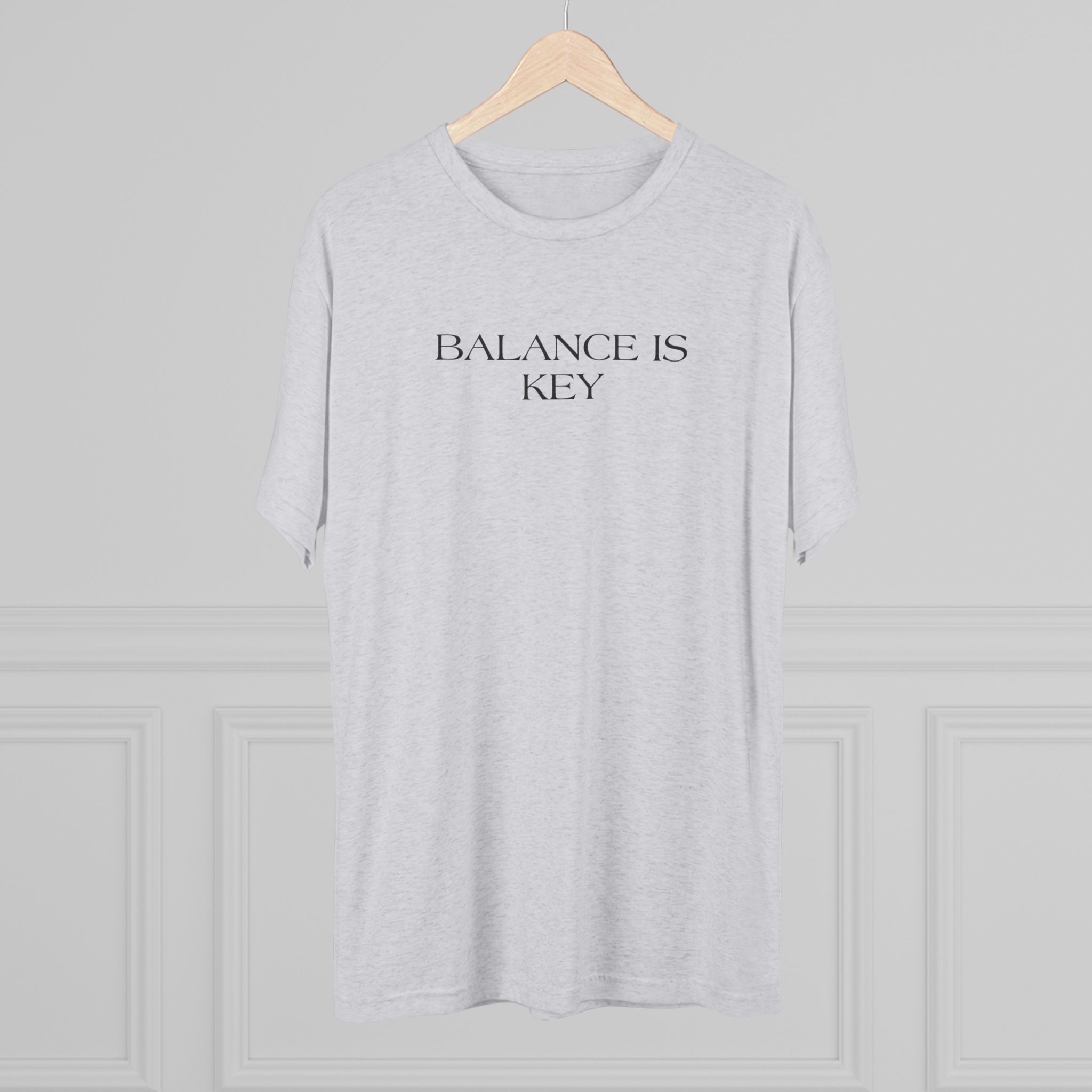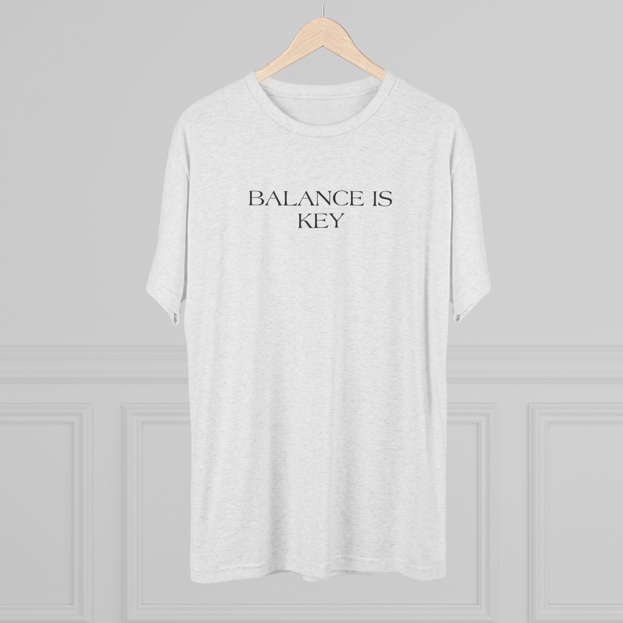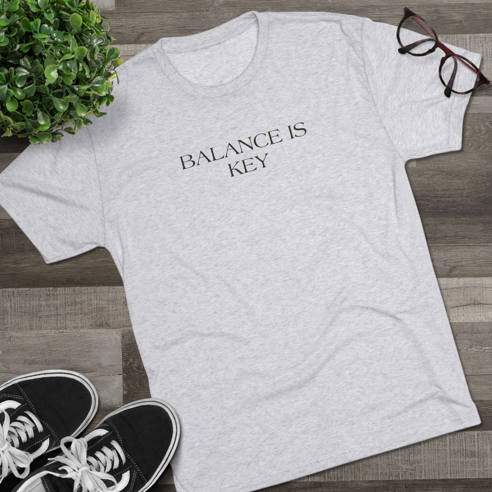 A soft, lightweight crew tee with a calm, minimalist message—“BALANCE IS KEY”—centered across the chest. The tri-blend fabric drapes gently against the body, giving a lived-in, effortless look that settles into daily routines. Wear it during slow mornings with coffee, midweek yoga cool-downs, or quiet walks that demand fewer distractions and more presence. The slim, understated type reminds the wearer to breathe, re-center, and choose steady rhythms over noise. Subtle enough to layer under a cardigan or bold enough to stand alone, this tee feels like a quiet nudge toward steadiness every time you pull it on.