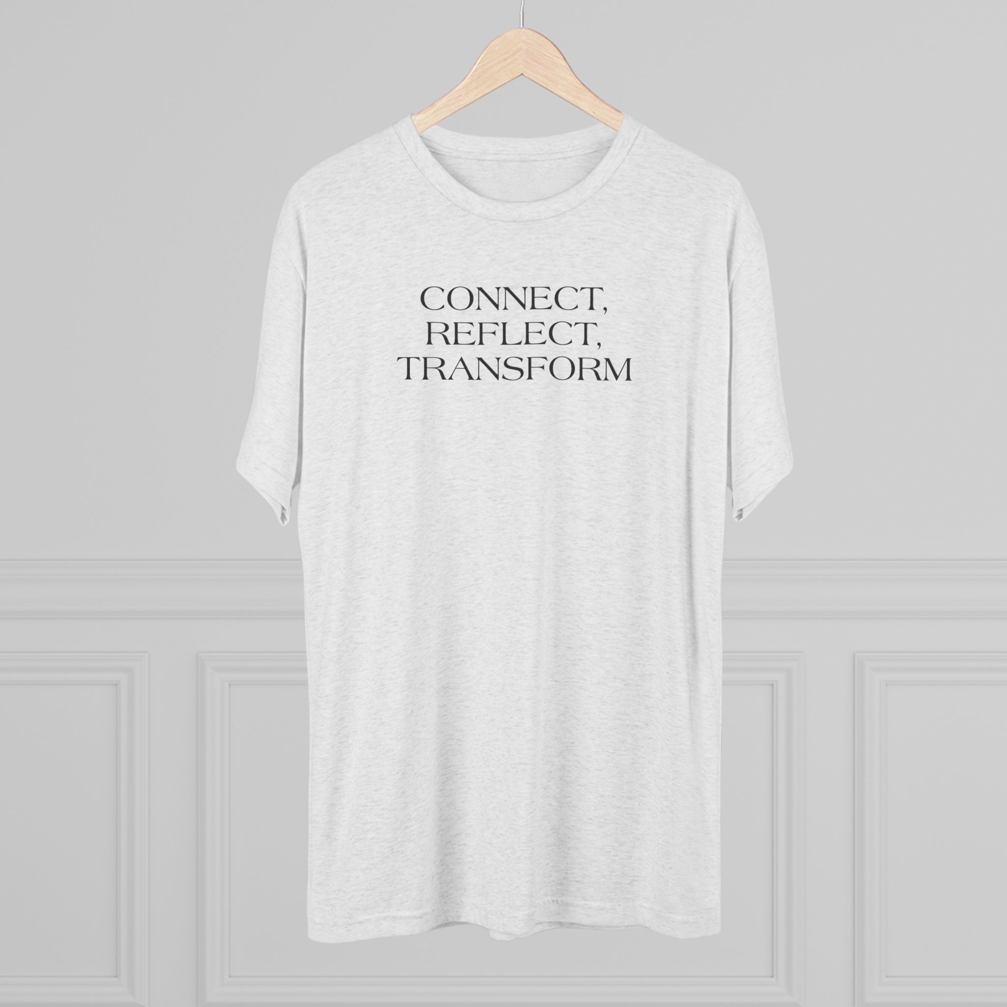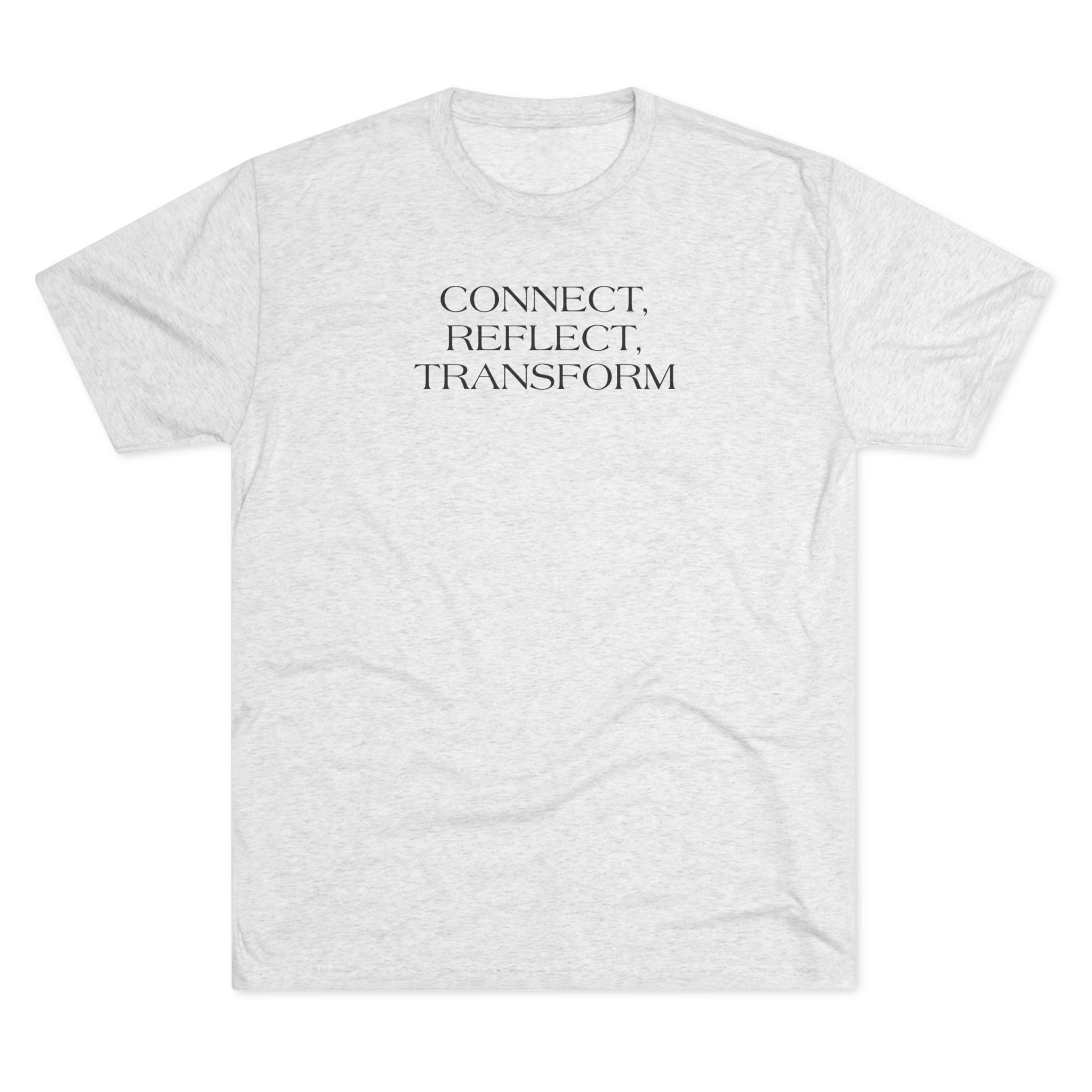 A lightweight, super-soft tee that carries a quiet, intentional message: “CONNECT. REFLECT. TRANSFORM.” Whispered in a minimalist serif at chest height, this shirt settles into the background of your day while nudging inward focus. The tri-blend drape feels lived-in from the first wear — breathable and flexible for long studio sessions, morning journaling, or calm walks. It pairs cleanly with relaxed jeans, layered cardigans, or yoga pants, fitting seamlessly into a mindful wardrobe.