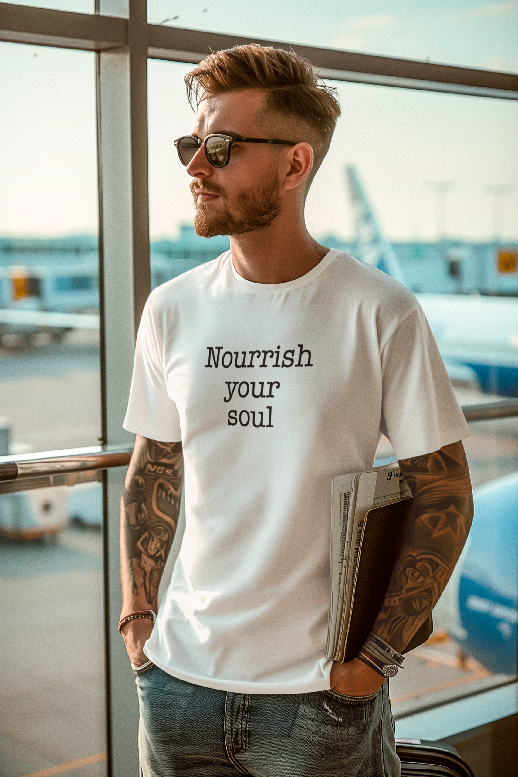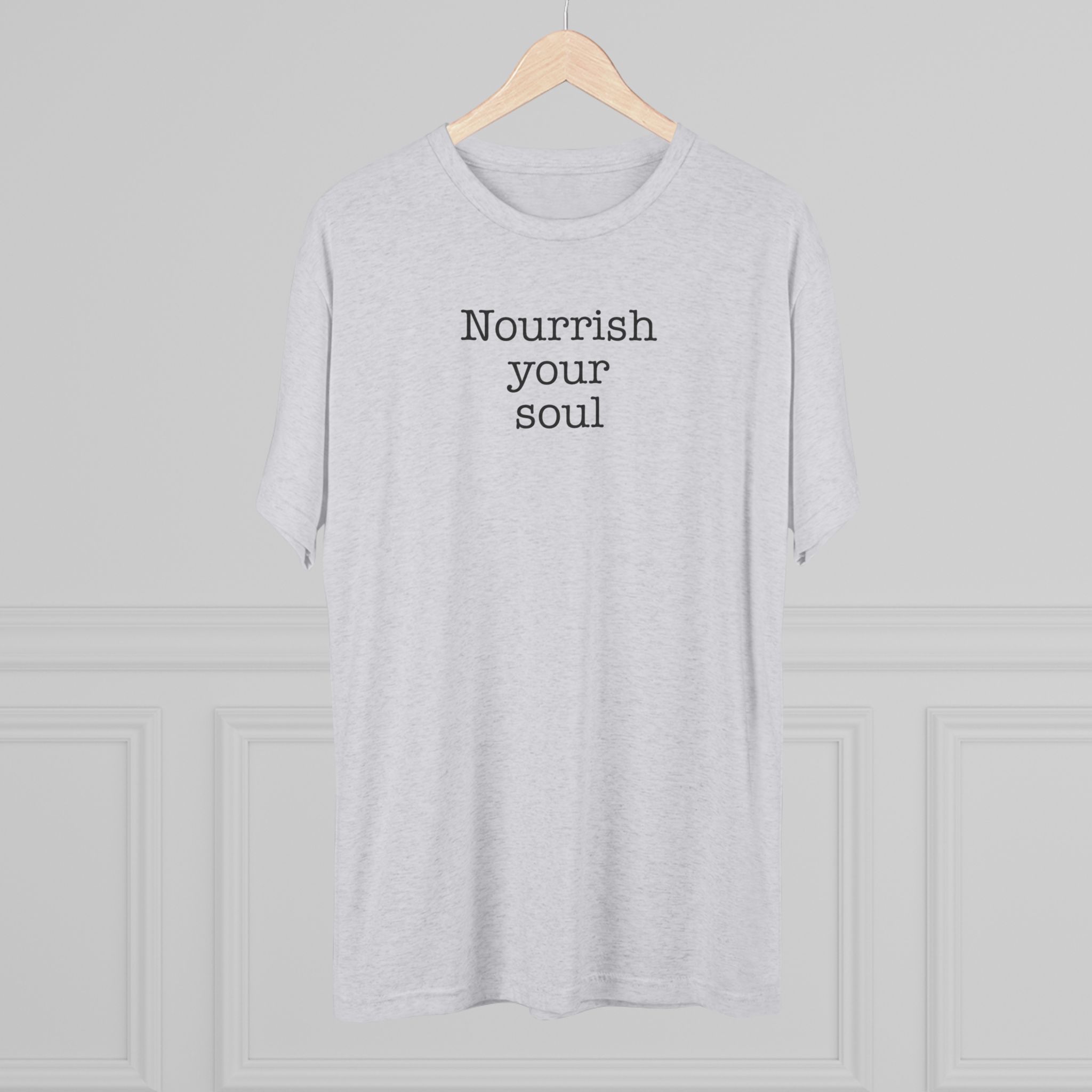 Soft, simple, and quietly intentional — this crew tee wears like a gentle nudge to slow down. A light heather canvas carries the understated text “Nourrish your soul” in a calm, serif type that reads like a personal reminder. The fabric drapes effortlessly, making it easy to layer under a cardigan for chilly mornings or pair with worn-in jeans for weekend wandering. It’s the kind of shirt that fits into ritual: yoga flow, coffee on the porch, library afternoons, or cozy walks after sunset. Minimal, tactile, and comforting — it’s meant to sit with you through small routines that matter.